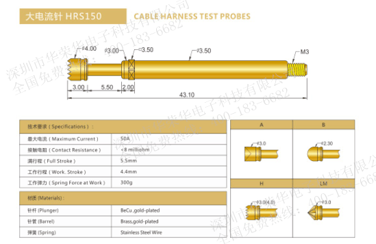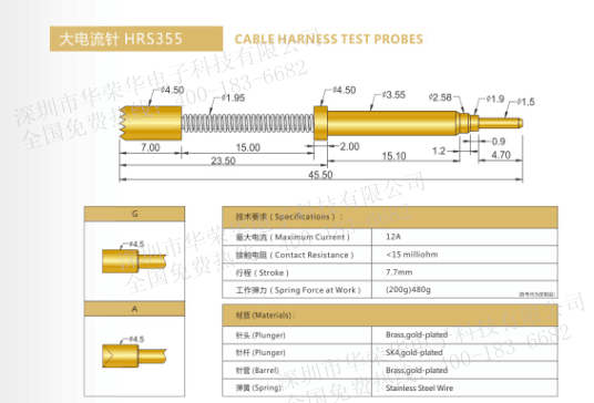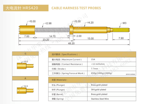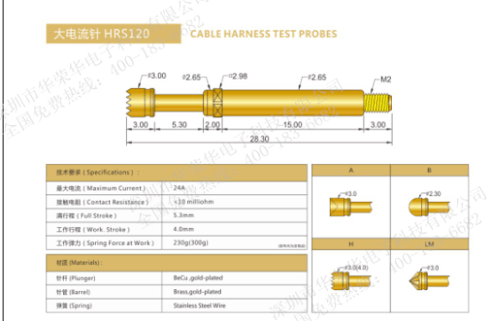 大電流針用于高電流行業(yè)的測(cè)試。主要測(cè)試、功能測(cè)試、信號(hào)傳輸、供電、生產(chǎn)期間以及作為內(nèi)置的觸電元件,還有一項(xiàng)應(yīng)用用途是精確測(cè)量,針對(duì)該用途要用電阻很低的測(cè)試探針,所以也叫底電阻探針。