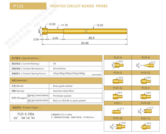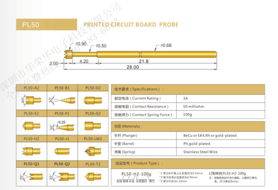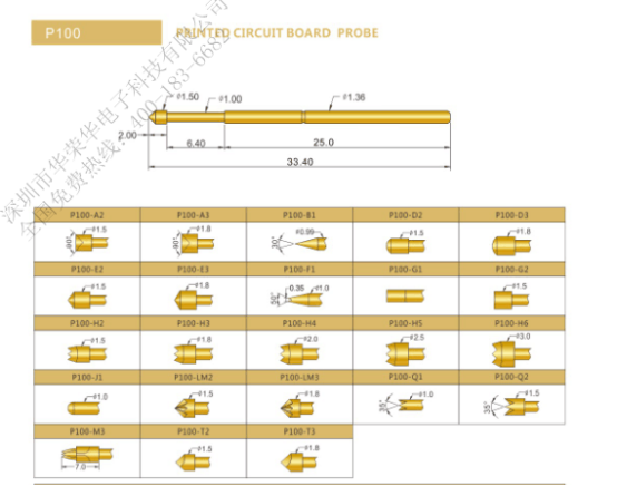 應(yīng)用于PCB的測試探針規(guī)格最早的有P125、P100、P075、P50。針頭少量如:九爪頭、皇冠頭、三面錐型頭、杯型頭等。
