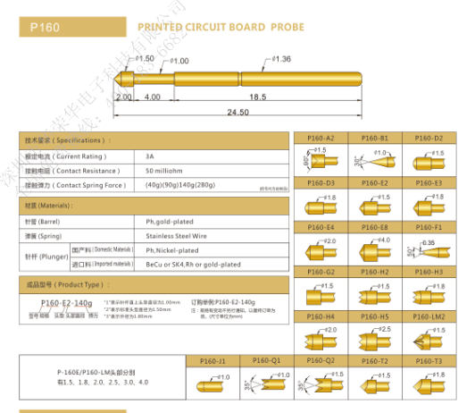 隨著工業(yè)發(fā)展和電子PCB的不斷升級,電子PCB測試探針也在研發(fā)各種規(guī)格的產(chǎn)品來滿足測試需求。從最早的單層板到目前發(fā)展的多層板喝軟板,由于不同大小的PCB板需要不同規(guī)格的PCB測試探針去滿足其測試,探針規(guī)格也不斷演化。如:P160、P75、PL75、PM75、PL50、G1353等。針頭添加了八爪皇冠頭、自我清洗三爪皇冠頭、Hb3帶膠管九爪針等等。探針的制作材料也越來多樣。多樣化的探針尺寸、頭型、彈力來滿足測試需求。