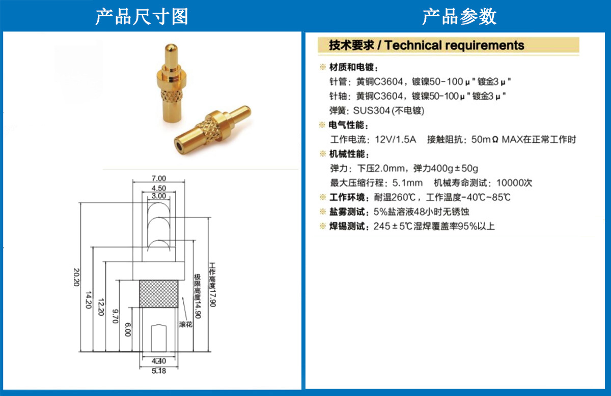 測試針,用于測試PCBA的一種探針。表面鍍金,內部有平均壽命3萬~10萬次的高性能彈簧      探針的材質:W,CU、A+1。W:彈性一般,容易偏移,粘金屑,需要多次的清洗,磨損損針長,壽命一般。A+:A+材質的免清針,這種材質彈性較好,測試中不容易偏移,并且不粘金屑,免清洗,因此壽命較長。     探針類型:懸臂探針和垂直探針。懸臂探針:劈刀型和環氧樹脂型垂直探針:垂直型     根據探針電子測試。探針可分為如下三種類型:光電路板測試探針:未安裝元器件前的電路板測試和只開路、短路檢測探針,國內大部分的探針產品均可替代進口產品在線測試探針:PCB線路板安裝元器件后的檢測探針;高端產品的核心技術還是掌握在國外公司