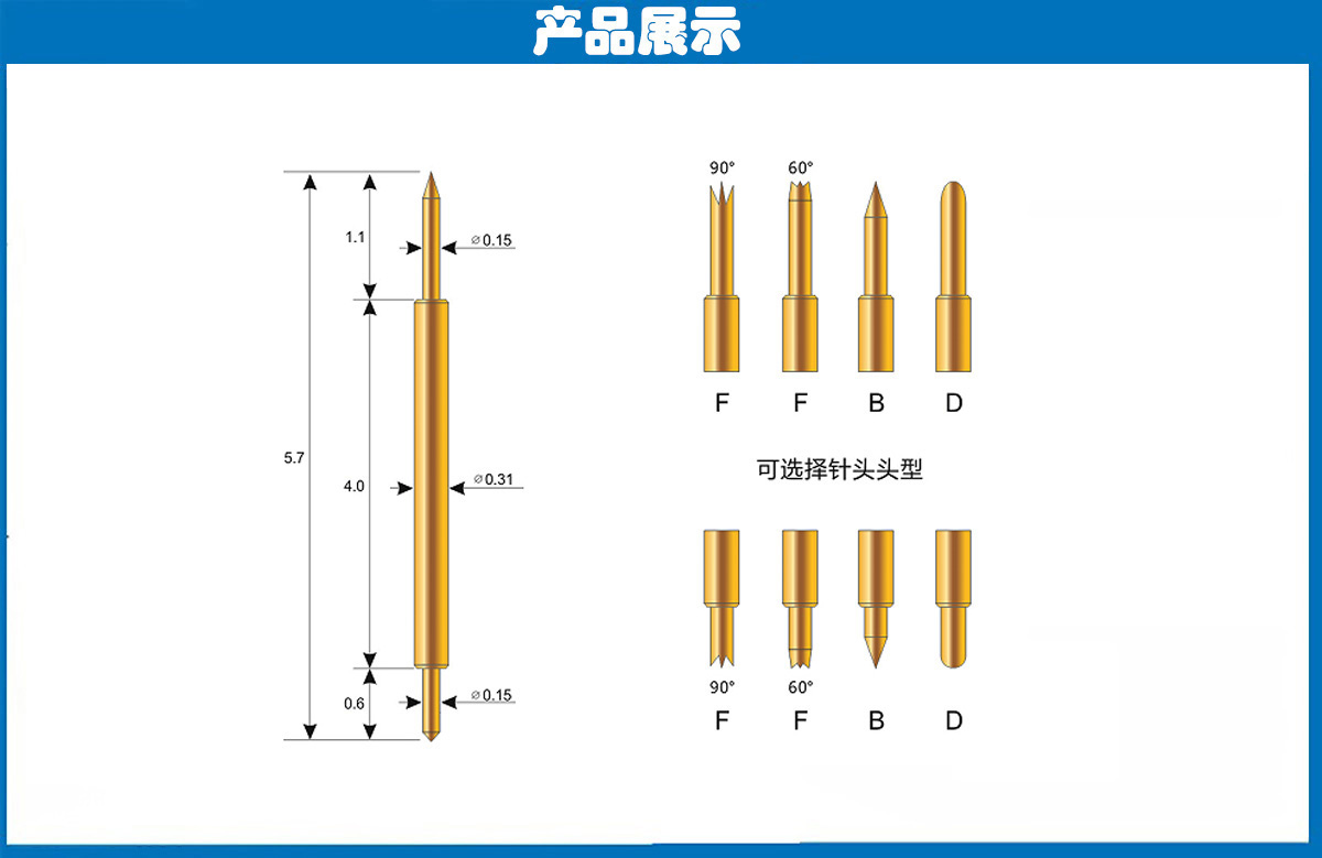 產品頭型:探針外徑為0.31mm,總長度為5.7mm、針的兩端的頭型均為尖頭、爪頭