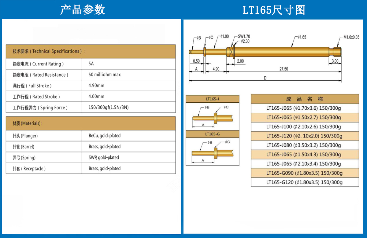 產品介紹:本產品一般用有定向作用的結束測試用,產品選用日本SK4 彈簧選用的是琴鋼線。工廠選用的材質都是比較硬的,有利于在測試的時候過大電流不會容易損壞。