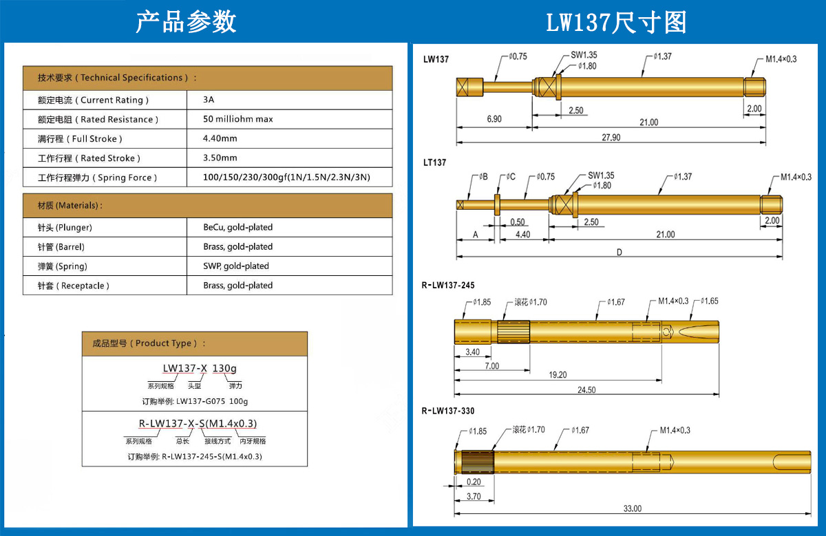 產品介紹:本產品一般用有定向作用的結束測試用,產品選用日本SK4 彈簧選用的是琴鋼線。工廠選用的材質都是比較硬的,有利于在測試的時候過大電流不會容易損壞。